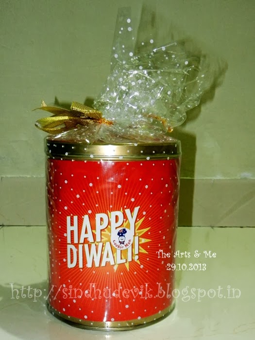 This is the Diwali gift for Venu from his office: a tin full of cookies! I was surprised and looked into calendar again and again to confirm that it is still dashami. I was very happy… looking at the cookies? No, no! I was actually happy for the tin and the gift wrap 😛 !